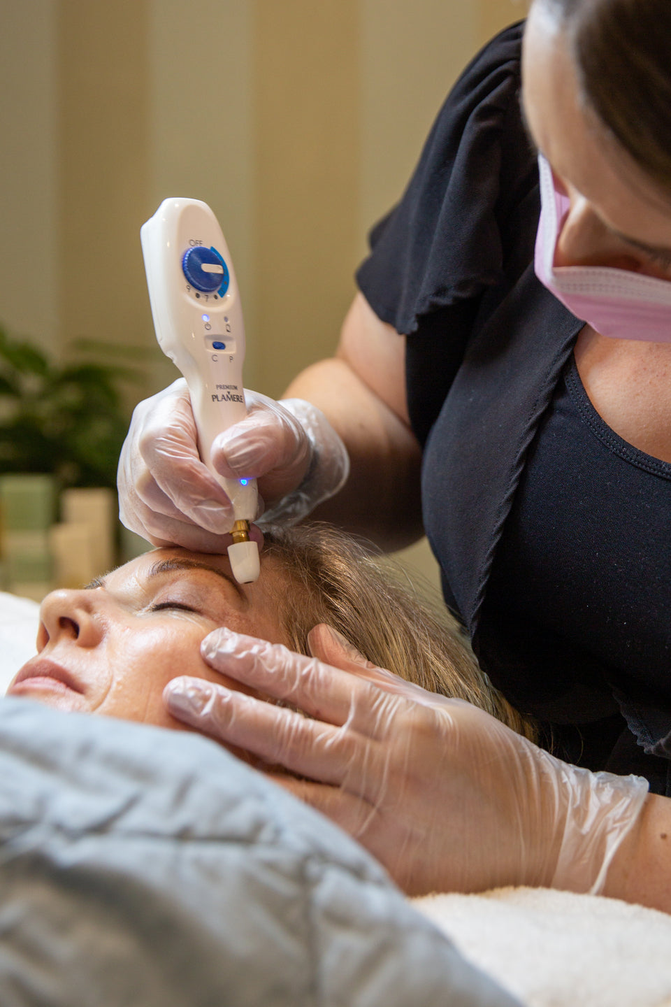 Our highly trained and certified Plasma Pen technicians use the device to deliver plasma fibroblasting. The Plasma significantly tightens, lifts, resurfaces and regenerates practically any area of the face and body. Plasma Pen converts electrical energy into gaseous diatomic molecular nitrogen and transmits that energized gas in a non-contact way to the skins surface from above. This causes a micro-trauma to the skins epidermal layer (top layers) whilst simultaneously heating and disrupting the deeper dermal structure via thermal conduction. This treatment is also known as fibroblasting. Fibroblasts are the most common cells of connective tissue in the body that produce collagen.